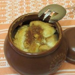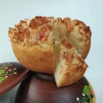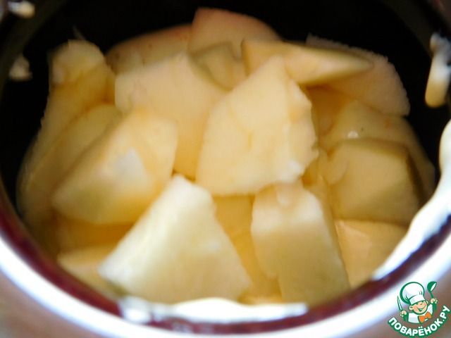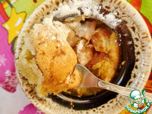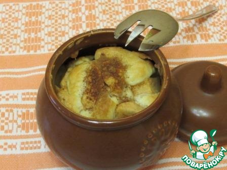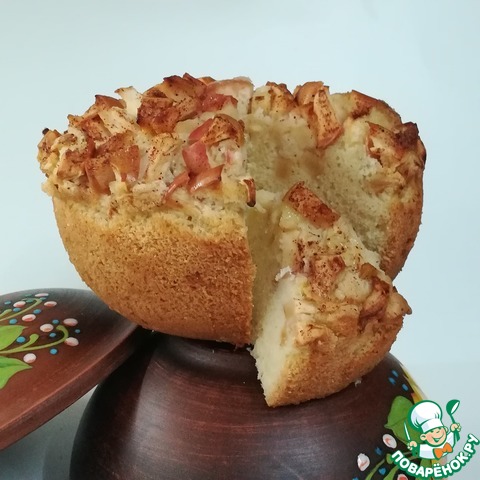 Разделить тесто на два горшочка (размер моего - 0,5 литров). Горшочек смазать маслом и вылить туда тесто. Сверху покрошить яблоко, мелкими кусочками и, по желанию, посыпать корицей.