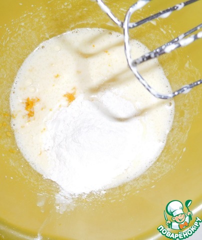 Яйца взбить с сахаром, в течении минут 5. Добавить цедру, муку и еще раз взбить до однородности. -