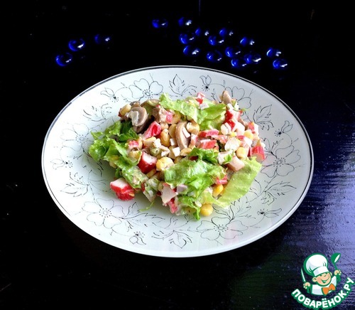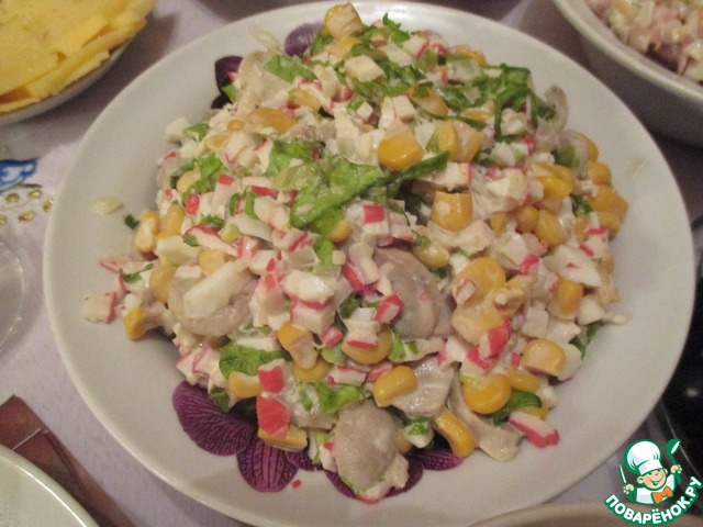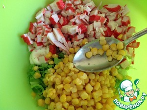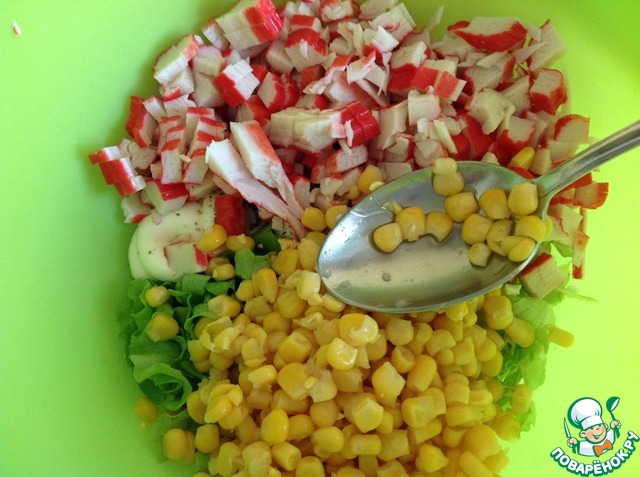 Всыпать кукурузу. Крабовые палочки порезать кубиком. Салат перемешать.