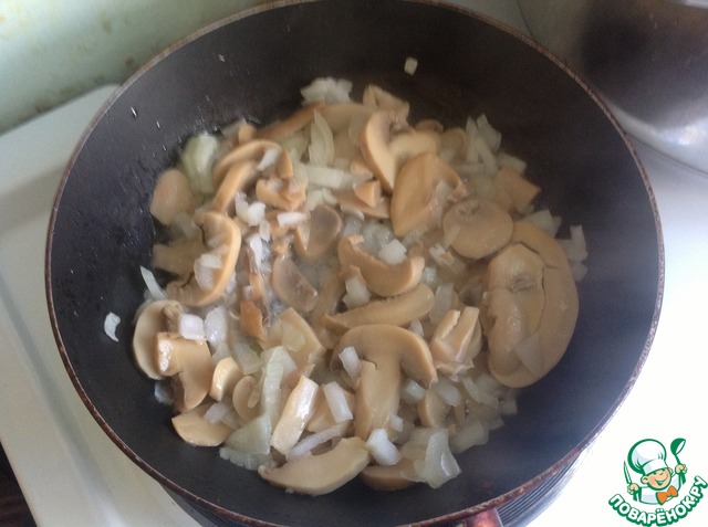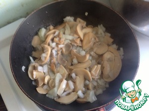 Лук нарезать мелким кубиком и обжарить вместе с грибами в небольшом количестве растительного масла до золотистого цвета. Остудить.