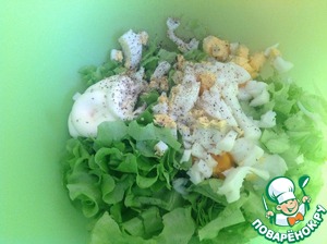 Нашинковать листья салата. Добавить майонез и молотый перец. Яйца порезать кубиком.