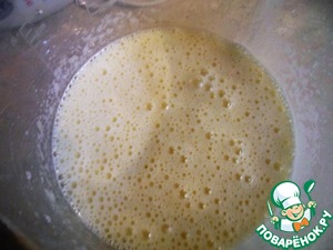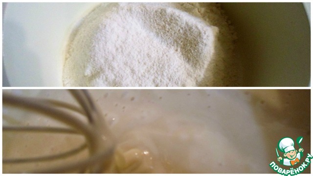 В просеянную муку с разрыхлителем и содой вливаем хорошо взбитую смесь.