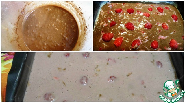 Из оставшегося теста отливаем часть в другую емкость, добавляем какао, взбиваем. Выливаем поверх клубники.
