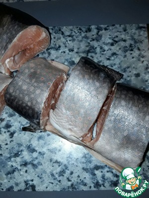 Рыбу чистим, моем и разрезаем на 4 или 5 порционных кусочка.