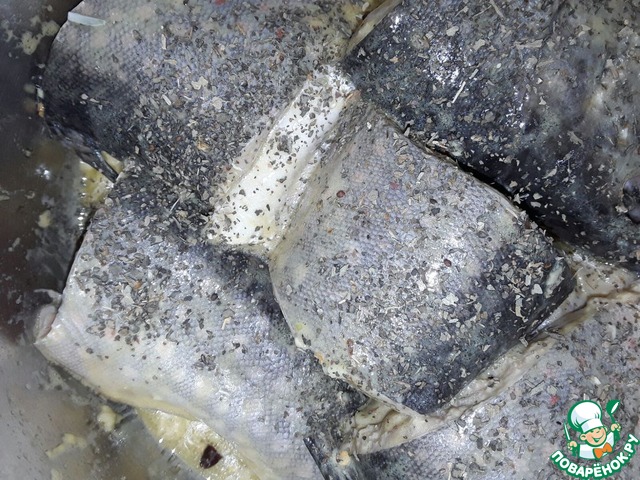 Хорошо перемешиваем маринад и опускаем в него рыбу. Стараемся, чтобы вся рыба была обмазана маринадом.