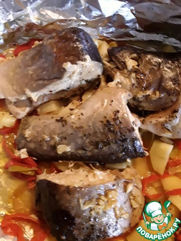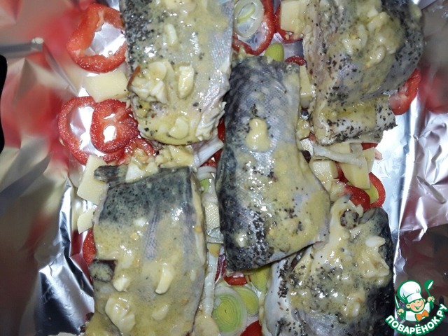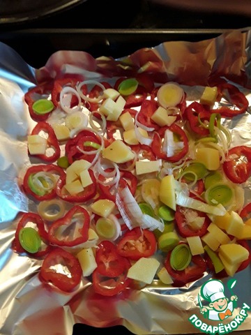 Кладём овощи на фольгу, сверху на овощную подушку выкладываем рыбу. Заворачиваем фольгу и ставим в духовку на 180 градусов на 30 минут
