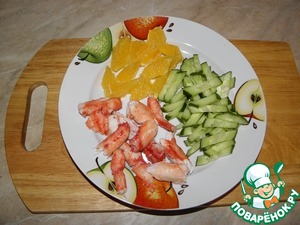 Огурец режем соломкой, апельсин и крабовое мясо кубиками (в общем кусочками какие нравятся)