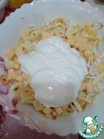 5. Делаем заправку: чеснок выдавливаем через пресс и перемешиваем со сметаной. Заправить салат. Посолить, поперчить по вкусу.