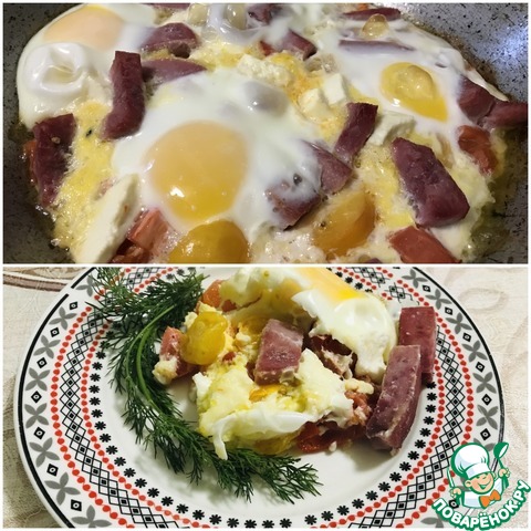 На дно огнеупорной формы кладем кусочки масла, сверху мелко порезанные помидоры, кусочки болгарского перца. Сверху порезанную кусочками брынзу и кусочки колбаски.