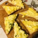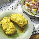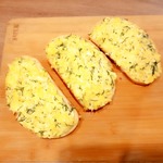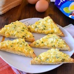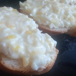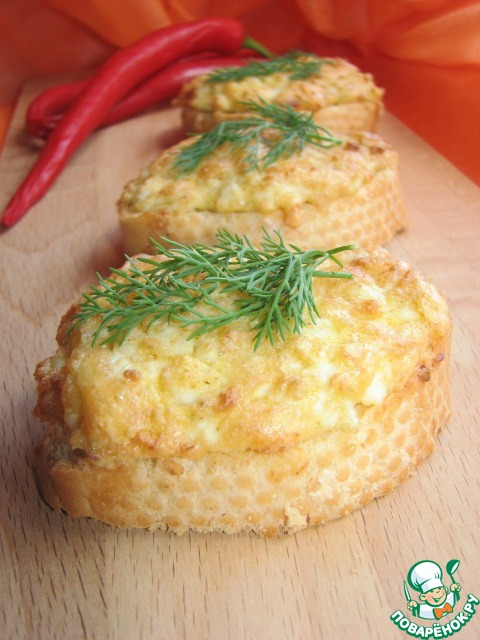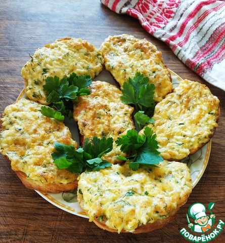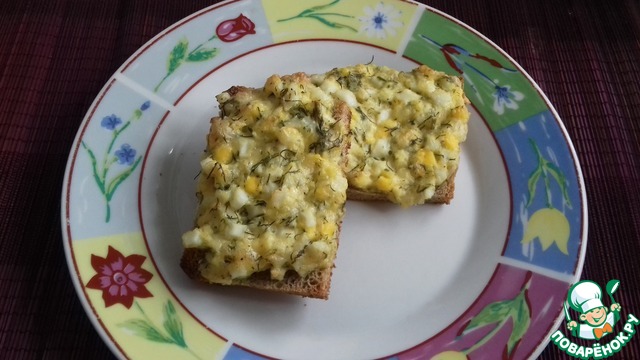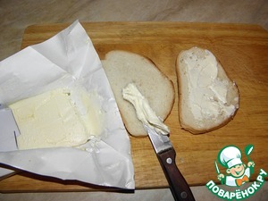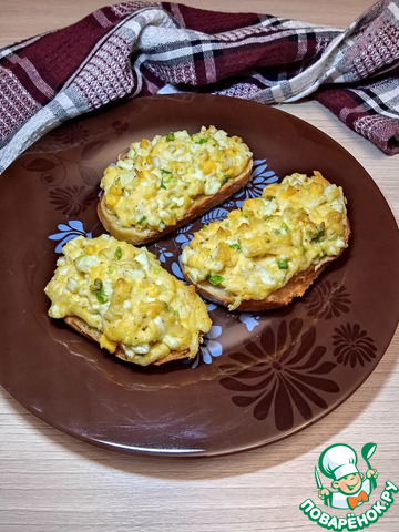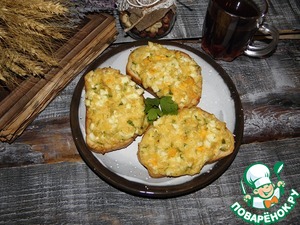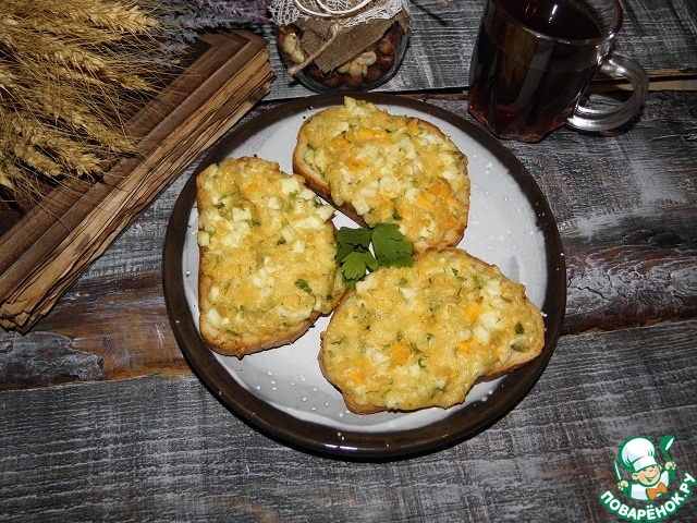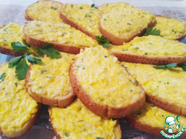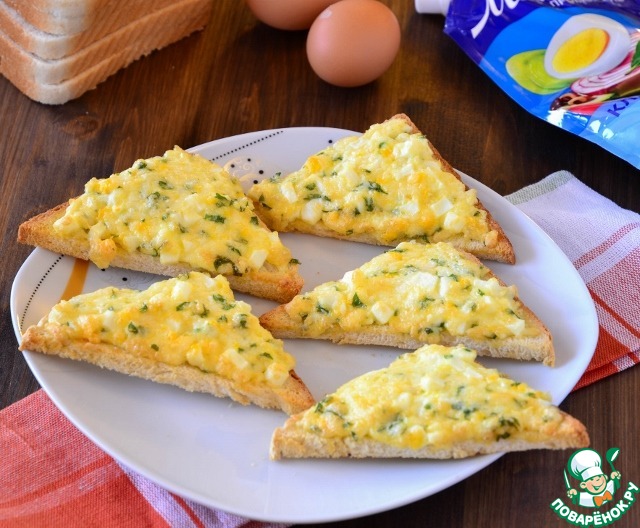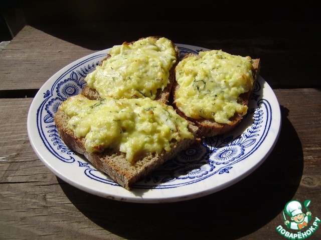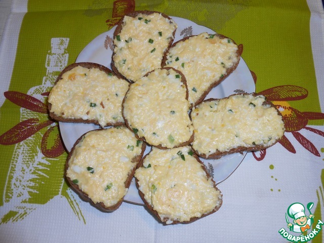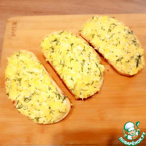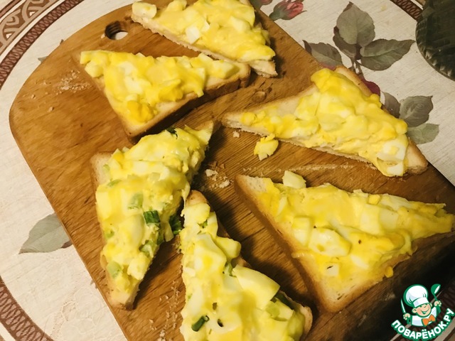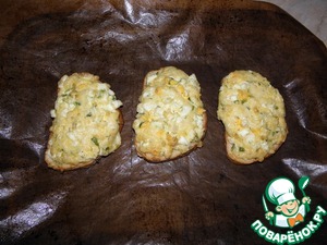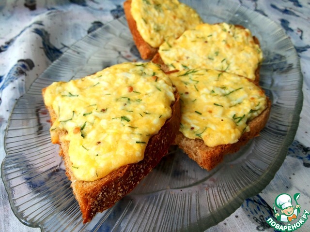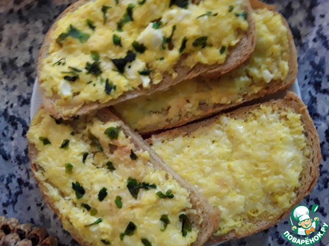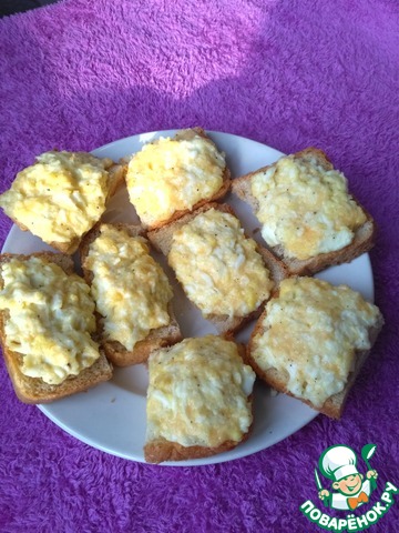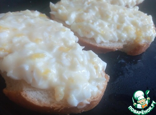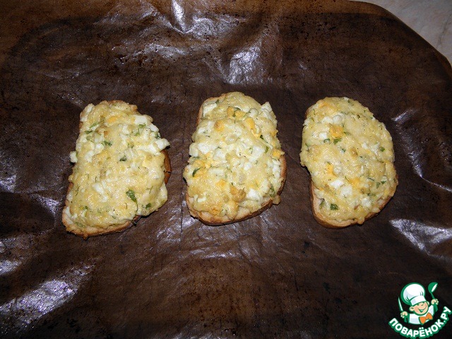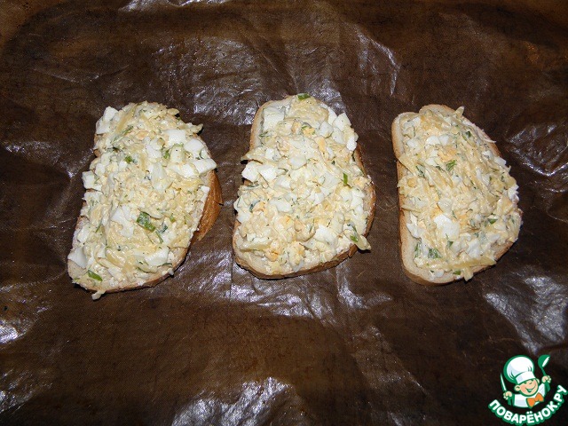 Толстым слоем выложить сырно-яичную массу на хлеб с маслом, противень застелить бумагой или ковриком