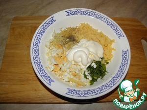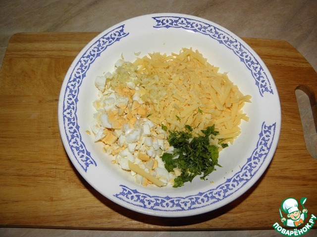 Яйца отварить, нарезать кубиком. сыр натереть на крупной терке, чеснок измельчить (чесночница) зелень мелко нарезать