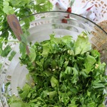 Зелень петрушки перебрать, промыть холодной водой, просушить и нарезать крупными кусочками, не мельчите. Толстые стебли я не использую.