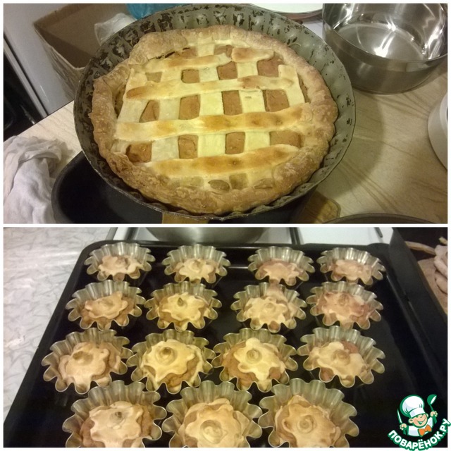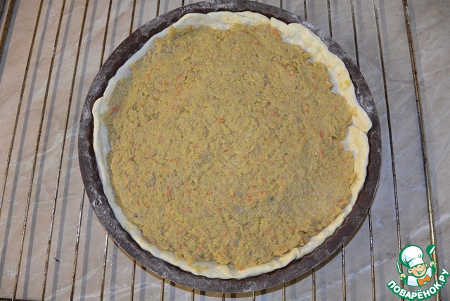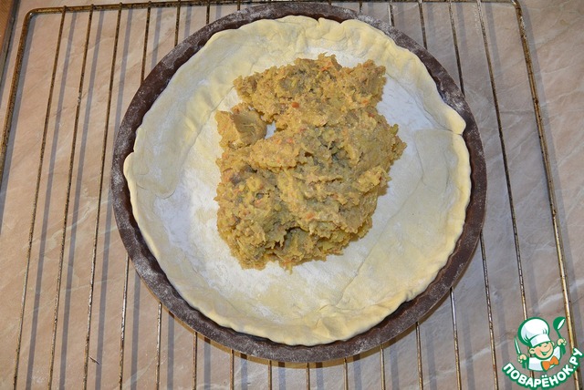 Тесто раскатать, вырезать круг, выложить в форму, сформировать бортики. Выложить начинку на середину теста и