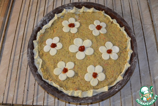 Защипить немного бортики к середине. Вырезать из остатков теста цветочки (серединки цветочков оформить кетчупом) и украсить пирог.