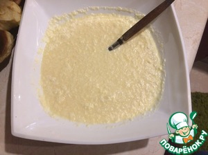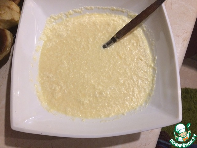 В это время пока кекс выпекается разминаю творог вилкой с сахаром и молоком, чтобы лучше разравнивался по поверхности кекса.