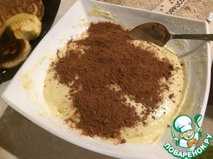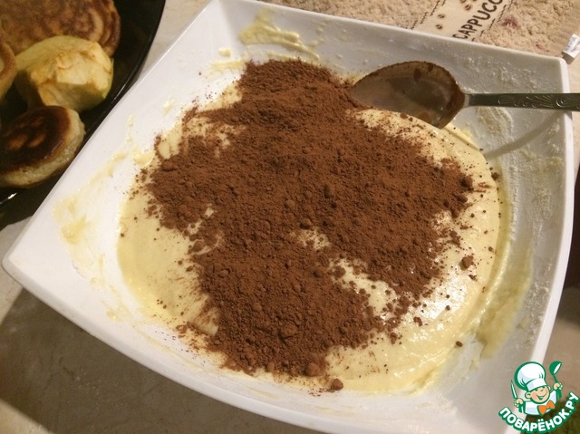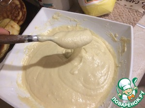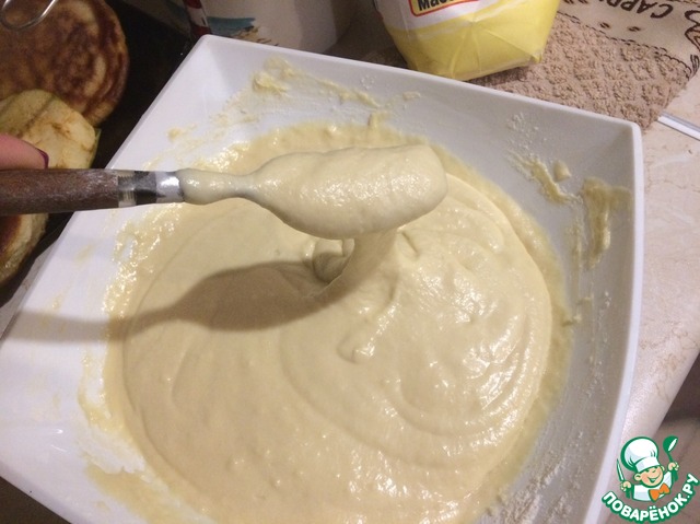3. Добавляю муку ( просеянную вместе с разрыхлителем), чтобы тесто было похожим на очень густую сметану.