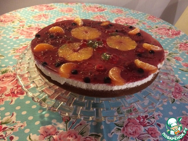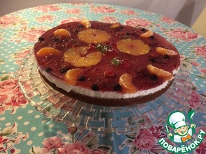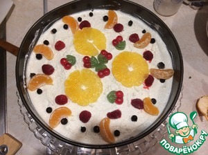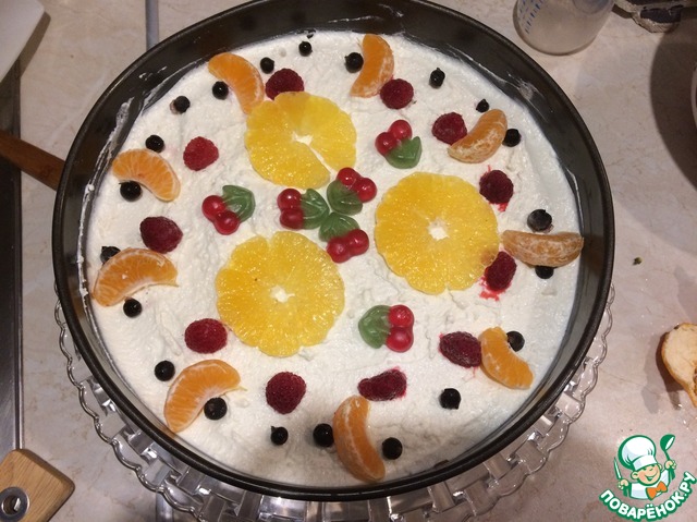 Сначала творожный слой. Затем на него фрукты и ягоды, которые у вас имеются, у меня была малина замороженная, смородина, апельсин, мандарин и несколько желатиновых конфеток в виде вишенок.