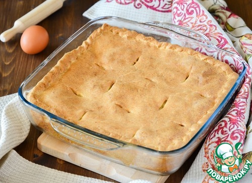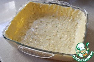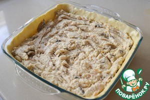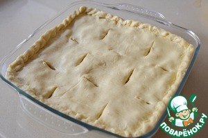 Оставшееся тесто раскатываем на пергаменте и переносим его сверху на начинку.