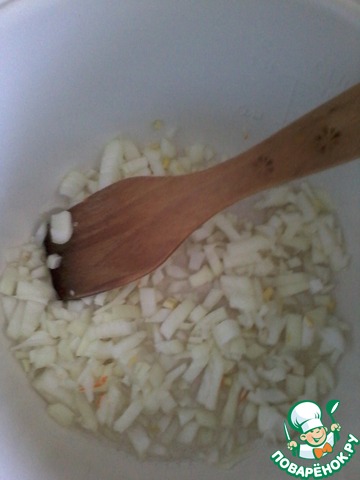 Включить мультиварку в режим «Жарка». Влить масло. Добавить лук. Пожарить пару минут при открытой крышке.