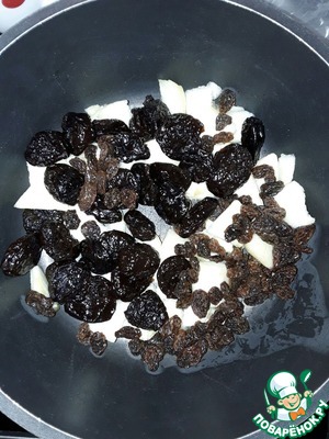 Сухофрукты ( чернослив, курага, изюм, яблоки, груши ) промыть в горячей воде и слить и выложить в казан.
