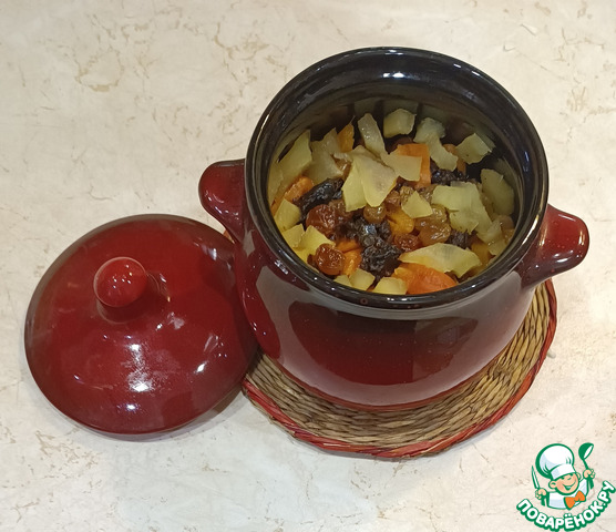 - Сухофрукты (Чернослив, курага, изюм, яблоки, груши) — 200 г
