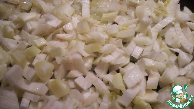 Луковицу чистим, режем кубиками. Фенхель моем, вырезаем плотную сердцевину и нарезаем кубиками, как и лук. Чеснок измельчаем любым способом. Обжариваем овощи до легкой золотистости на растительном масле, у меня оливковое.
