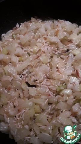 Добавляем рис (у меня басмати), припускаем вместе с овощами до побеления. Добавляем полчайной ложки кайенского или жгучего перца.