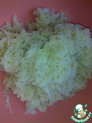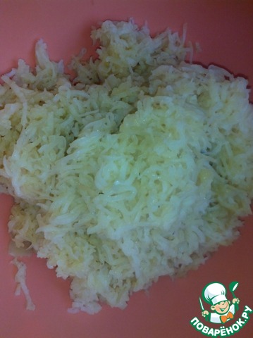 Картофель помыть, отварить в мундире, очистить и натереть на мелкой терке.