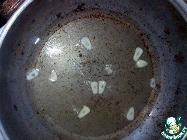 Налить масло, нарезать чеснок и положить в масло и немного обжарить, чтобы чеснок отдал аромат маслу и вытащить. -