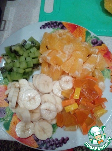 Нарезаем банан, киви, апельсин и мармелад. -