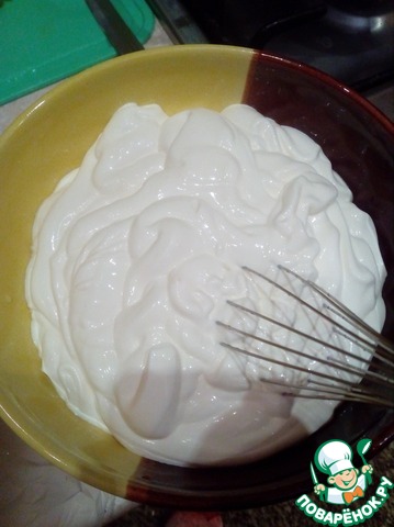 Отдельно взбиваем 500 г сметаны со стаканом сахара, чтобы растворился сахар.