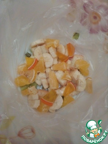 В нашу тару насыпаем часть нарезанных фруктов и бисквита. -