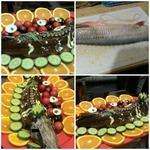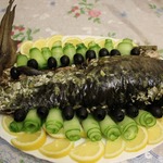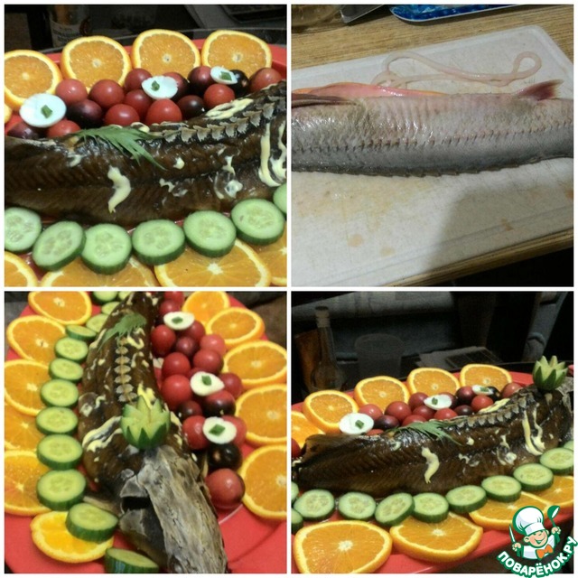 Перед подачей (а подавать осетра, мне кажется, лучше чуть немного остывшим) выложить нашего красавца на блюдо, украсить фруктами, овощами, зеленью.