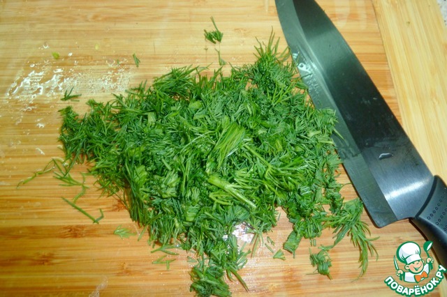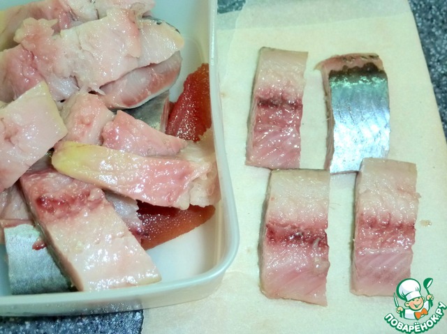 Филе сельди разрезать на кусочки шириной 1-2 см. -