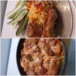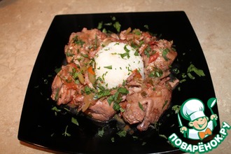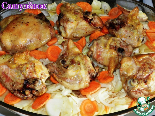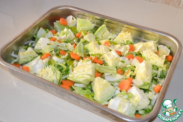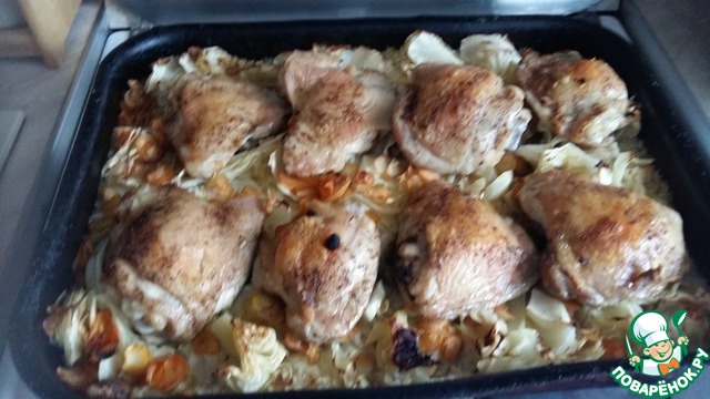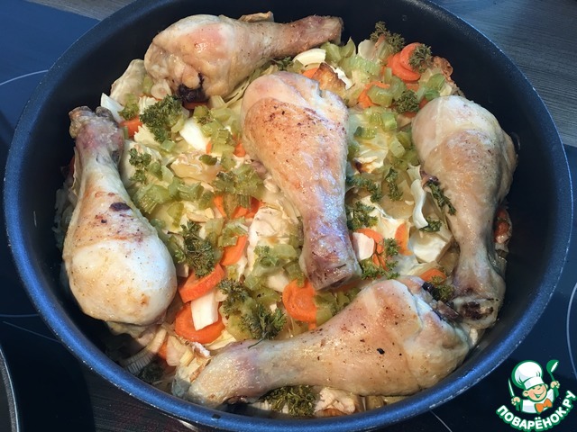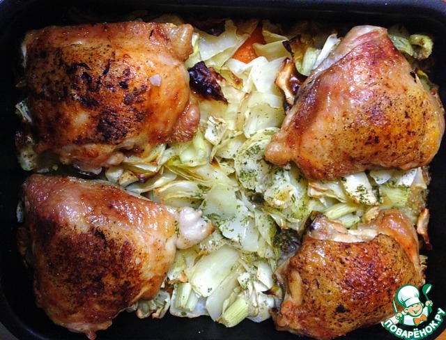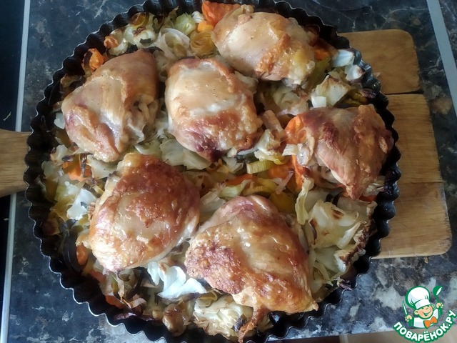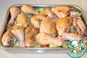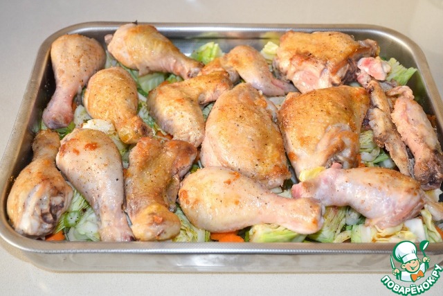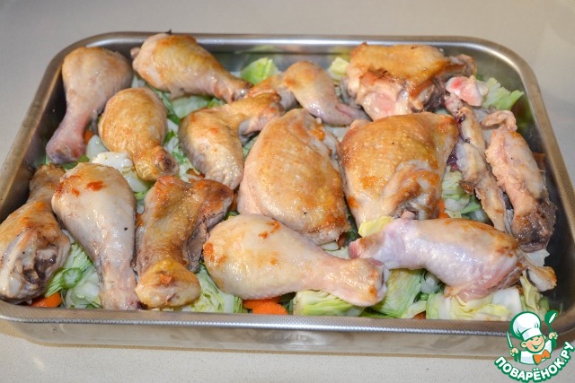 Сверху на овощи - кусочки курицы.