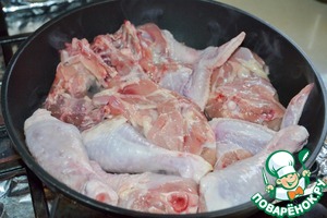 На сильно раскаленную сковороду выкладываем курицу кожей вниз.