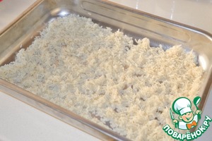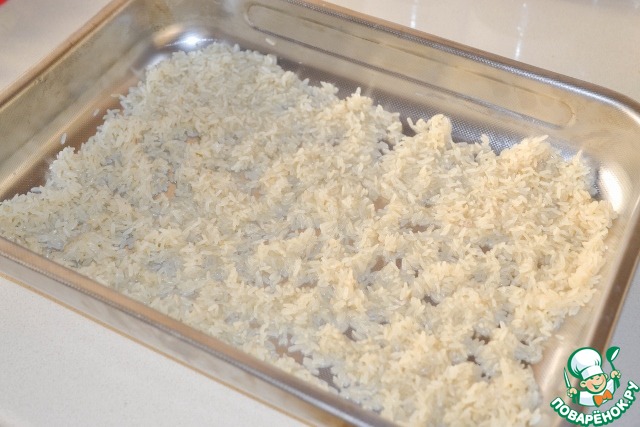 В глубокий противень выкладываем ровным слоем промытый рис.