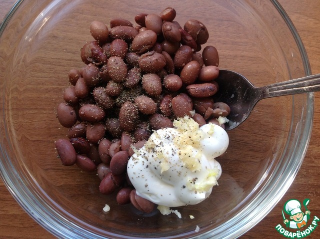 Фасоль отварить и остудить. К фасоли добавить майонез, смесь молотых перцев и чеснок пропущенный через пресс.