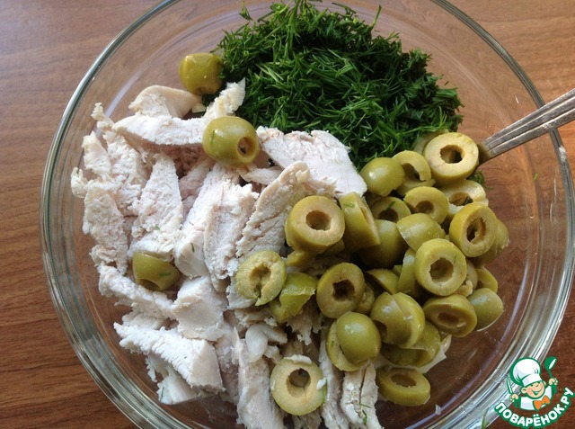Укроп мелко нашинковать, оливки нарезать кружочками. Куриную грудку нарезать пластинками или соломкой, но не мелко. Кусочки курицы должны быть достаточно крупной нарезки.