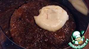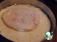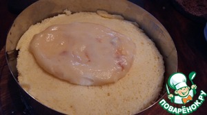 Все готово, можно собирать торт. Для удобства я это делаю в сервировочном кольце. На дно уложить коричневый корж с ароматной пропиткой, нанести на него половину абрикосового крема. |