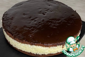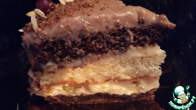 Уложить сверху светлый бисквит и нанести на него вторую часть абрикосового крема. Накрыть торт коричневым бисквитом. |