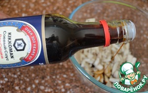 Кальмары нарезать, 3 * 4 см. Влить соевый соус, перемешать.