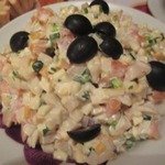 Выложить салат, украсить маслинами.