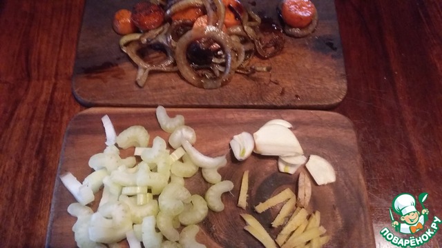Сельдерей, чеснок и имбирь прорезать тонкими ломтиками. -