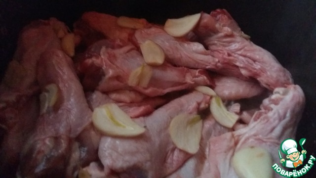 На дно чаши мультиварки выложить все овощи, затем крылышки /не солить/, посыпать сверху чесноком.