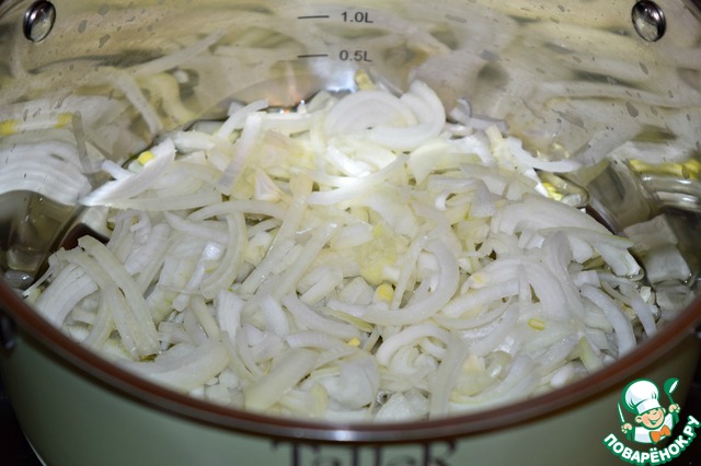 В кастрюле разогреть оливковое масло (подсолнечное) и обжарить лук до мягкости. -