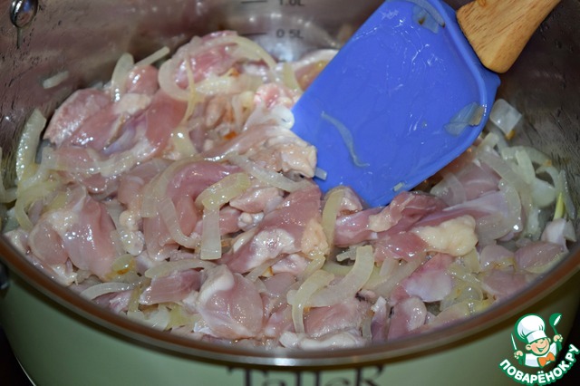 Куриное филе (я готовила из куриного бедра) нарезать небольшими кусочками и выложить его к луку.