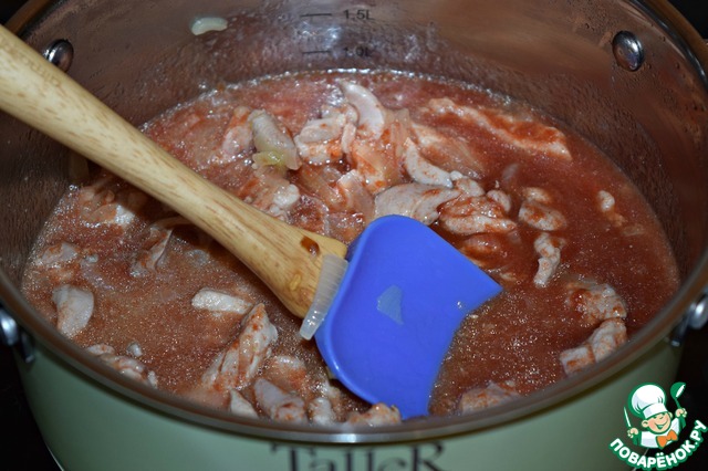 Влить в кастрюлю томатный сок, накрыть крышкой и тушить минут 5.