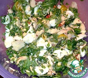 Зелень порвала руками, нарезала вареное филе курицы, яйца, сельдерей и чеснок.
