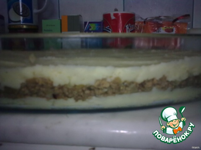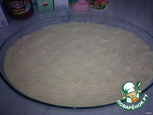 На противень выкладываем слоями: пюре - фарш - пюре.
